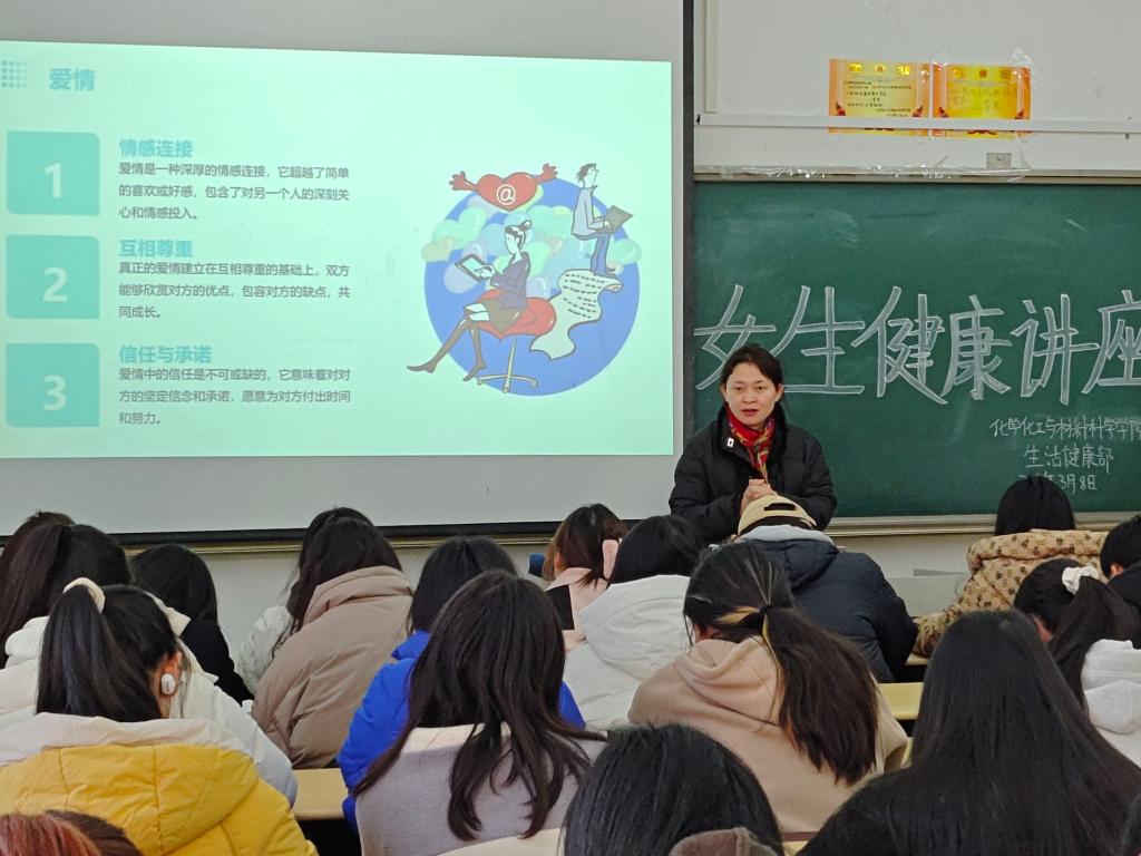 3月8日下午,太阳集团网tyc9728在综合楼1208教室举办女生健康教育专题讲座。讲座由学校女生教育工作室李春芳老师主讲,部分女生聆听了讲座。
