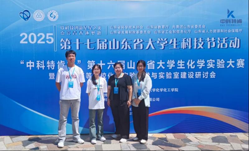 2025年7月18-21日,第十六届山东省大学生化学实验大赛暨山东省高等院校化学实验教学与实验室建设研讨会在山东理工大学举行。本次大赛共有来自全省30所高校的127名本科生参加比赛,大赛内容分上机理论考核和综合实验操作两部分。我院2023级化学专业的刘大为、丁熠佩、车梦娣和乔秀林4位同学参加本次比赛,经过激烈角逐, 车梦娣同学获得一等奖,丁熠佩和乔秀林两位同学获得二等奖,刘大为同学获得三等奖。