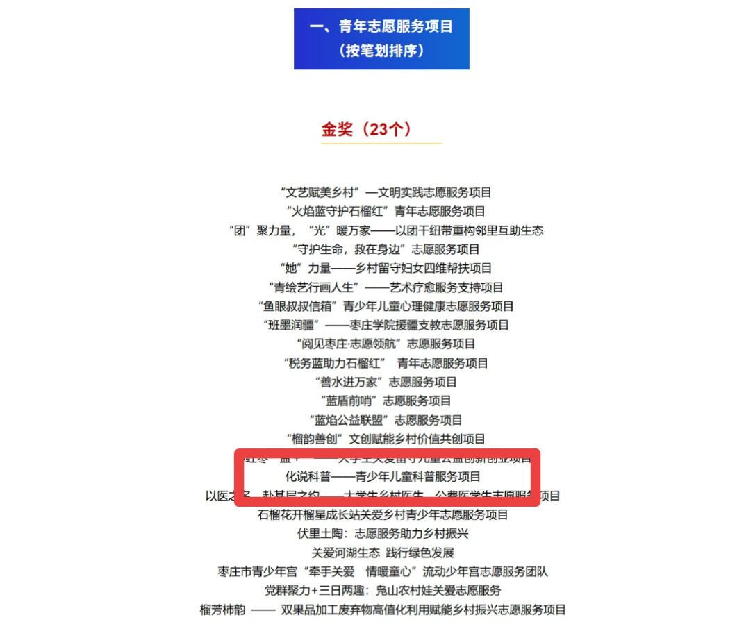 近日,第六届枣庄市青年志愿服务项目大赛圆满落幕,我院化说科普——青少年儿童科普服务项目凭借出色的志愿服务成效与专业特色,在大赛中斩获金奖。