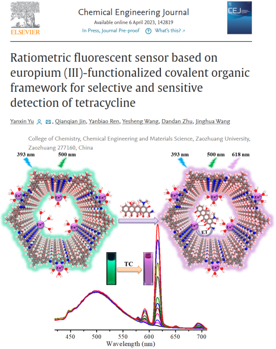 近日,我院于延新博士及团队在抗生素检测方面的研究取得新进展,相关工作发表在国际著名期刊《Chemical Engineering Journal》(中科院1区,TOP期刊,影响因子16.744)上,论文题目为:Ratiometric fluorescent sensor based on europium (III)-functionalized covalent organic framework for selective and sensitive detection of tetracycline。