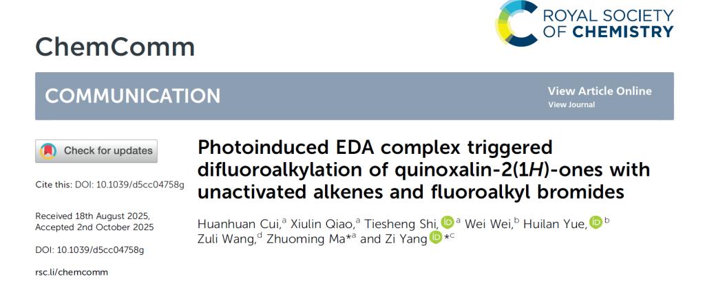 研究成果二:《Photoinduced EDA complex triggered difluoroalkylation of quinoxalin-2(1H)-ones with unactivated alkenes and fluoroalkyl bromides》。本研究开发了一种新颖、实用的光化学方法,用于合成C3-二氟烷基化的喹喔啉酮类化合物。其最大的亮点在于巧妙利用底物自身形成EDA复合物,完全规避了金属催化剂和外源光催化剂的使用,体现了绿色化学和步骤经济性的核心理念。这项工作不仅为含氟喹喔啉酮库的快速构建提供了强大工具,也为其在药物发现和功能材料中的应用开辟了新的可能性。更重要的是,这种基于EDA复合物的催化模式为其他类型惰性化学键的活化与官能团化提供了新的思路和借鉴。崔环环博士为本论文第一作者,tyc太阳成集团9728为第一完成单位。该研究得到山东省自然科学基金和tyc太阳成集团9728博士基金等项目支持。