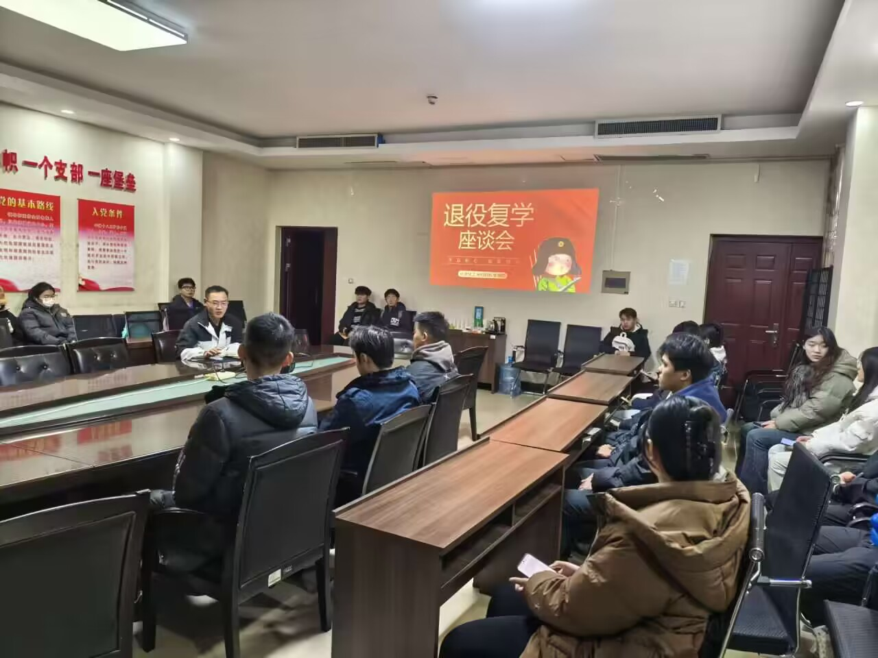 为进一步落实国防教育工作要求,坚定不移服务新时代强军梦、中国梦,11月29日下午,学院在综合楼1220室召开“不忘初心,砥砺前行”退役大学生座谈会。辅导员王明琛,退役大学生士兵及各年级志愿入伍学生参加了此次会议。